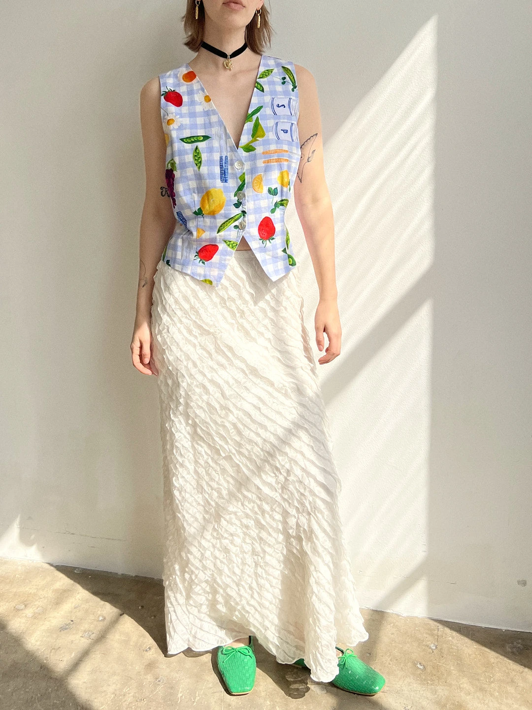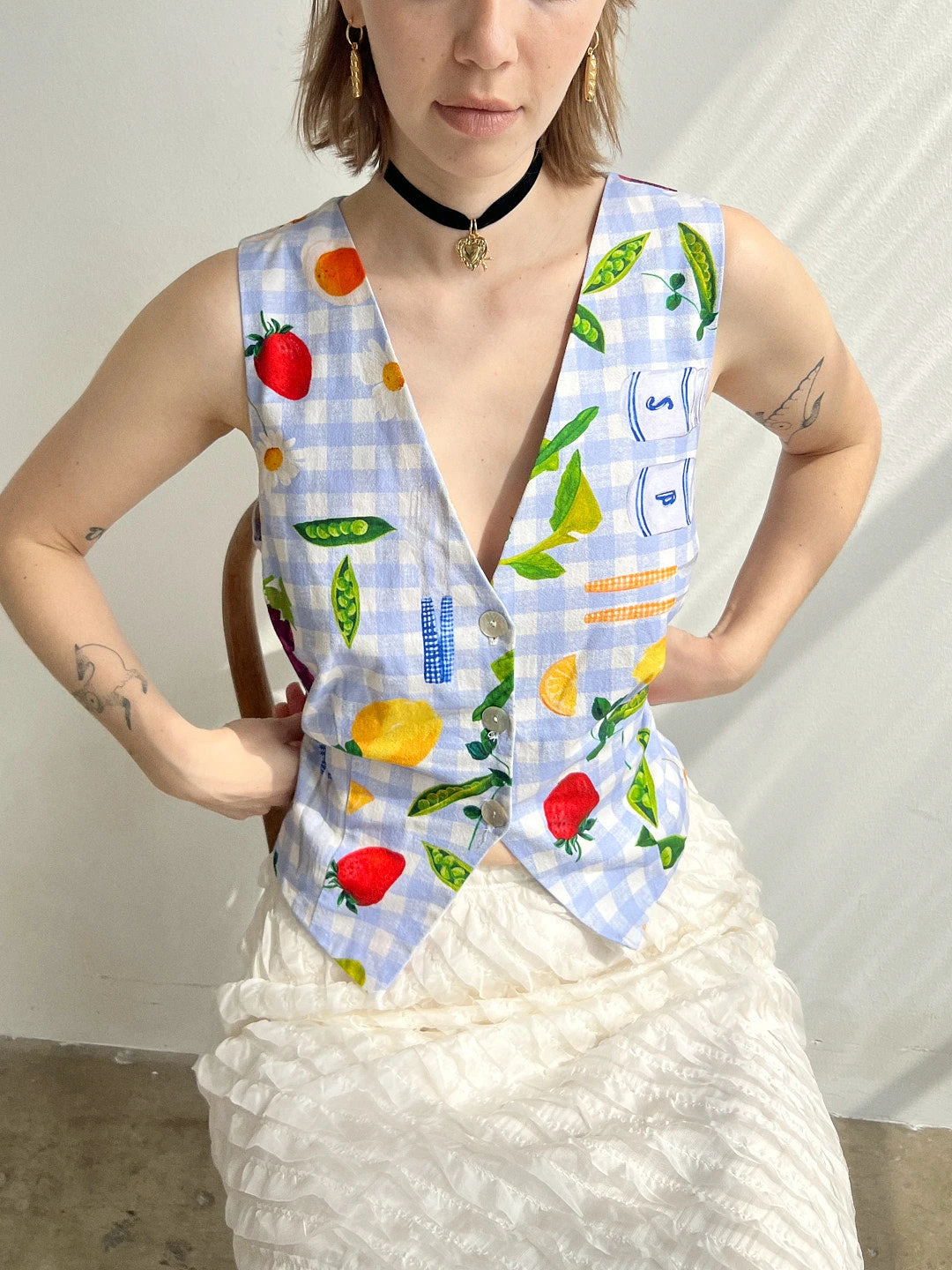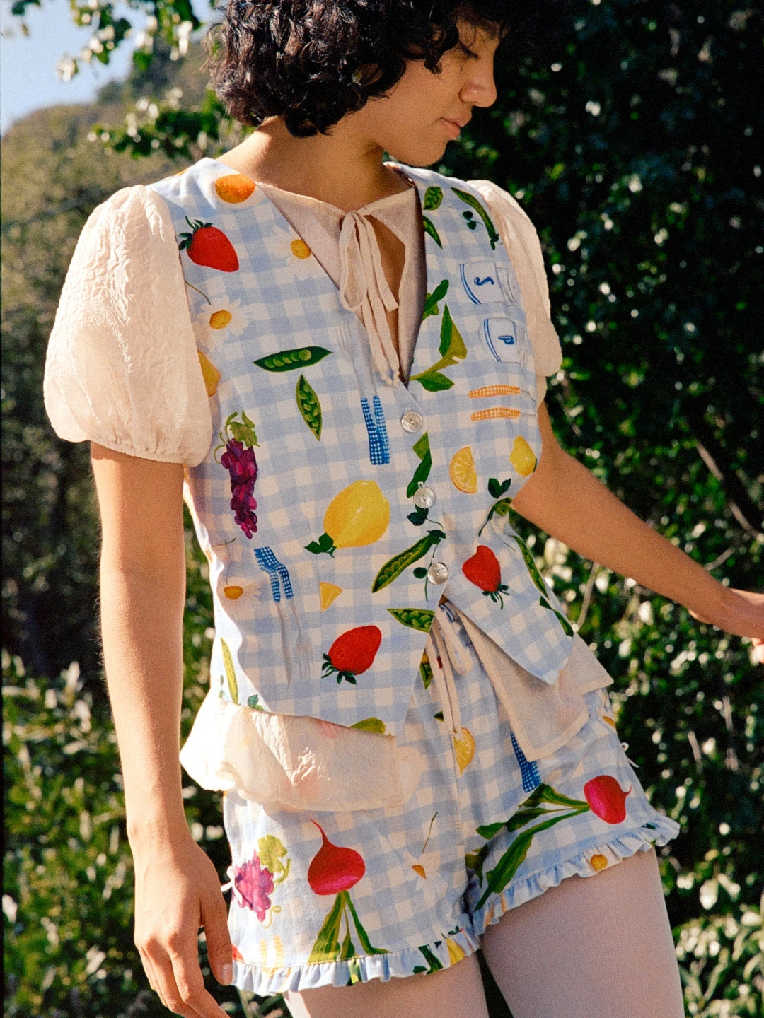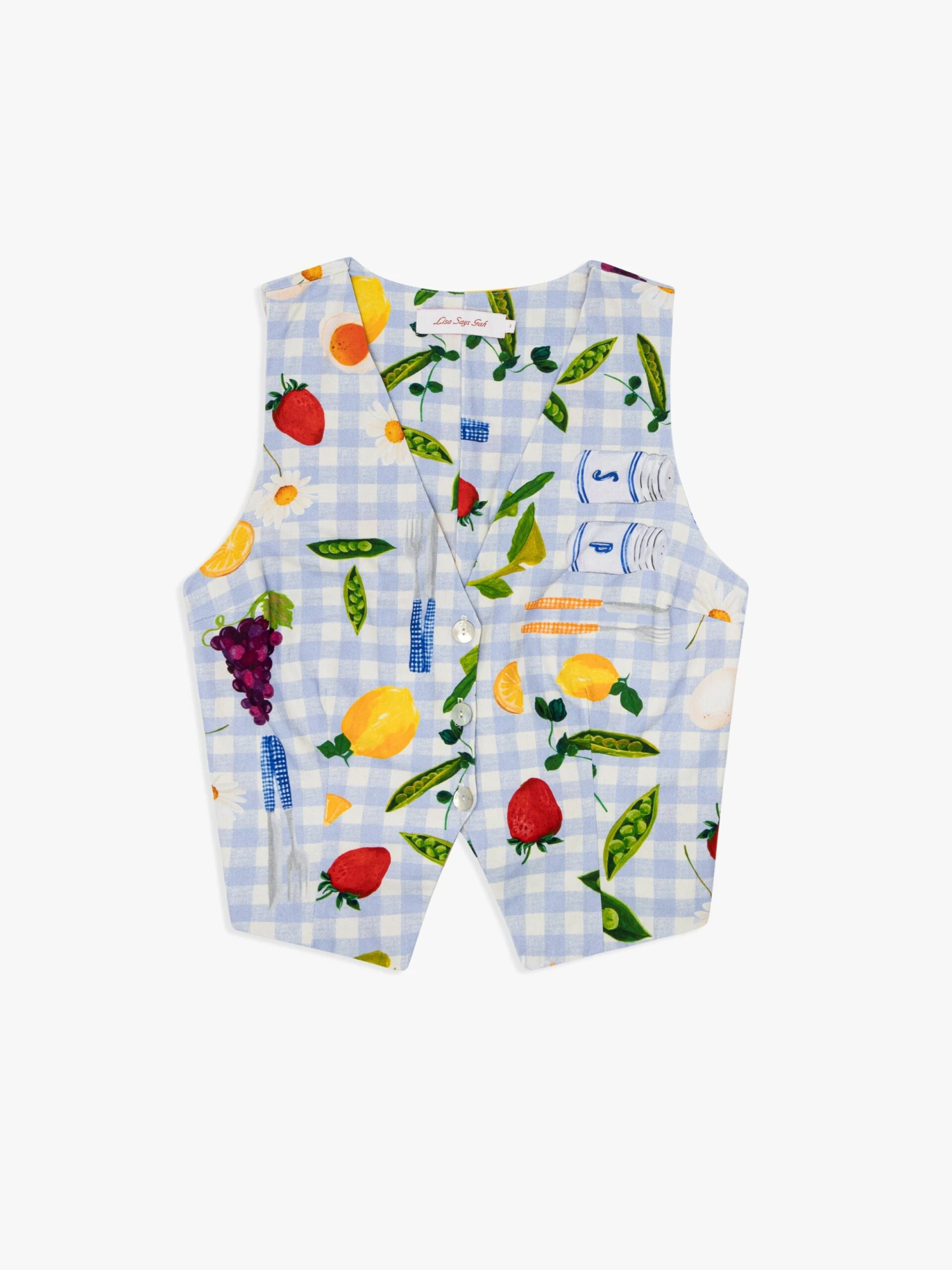 The Riley vest features three shell buttons in the front, an adjustable waist strap, and a picnic print over blue gingham.