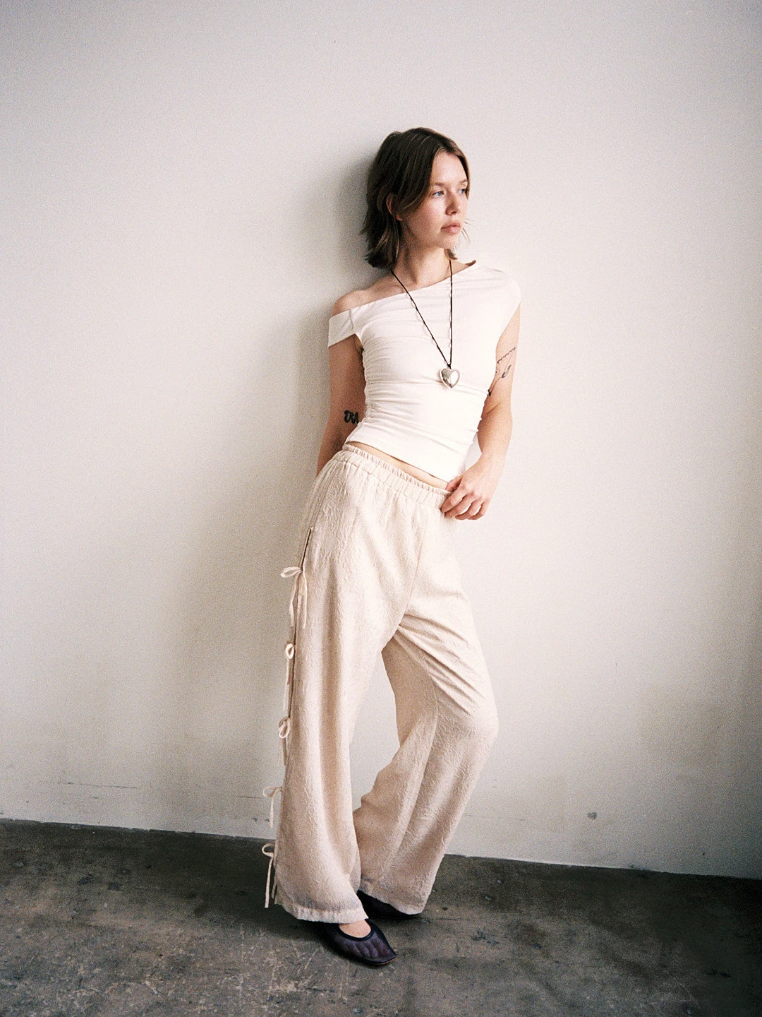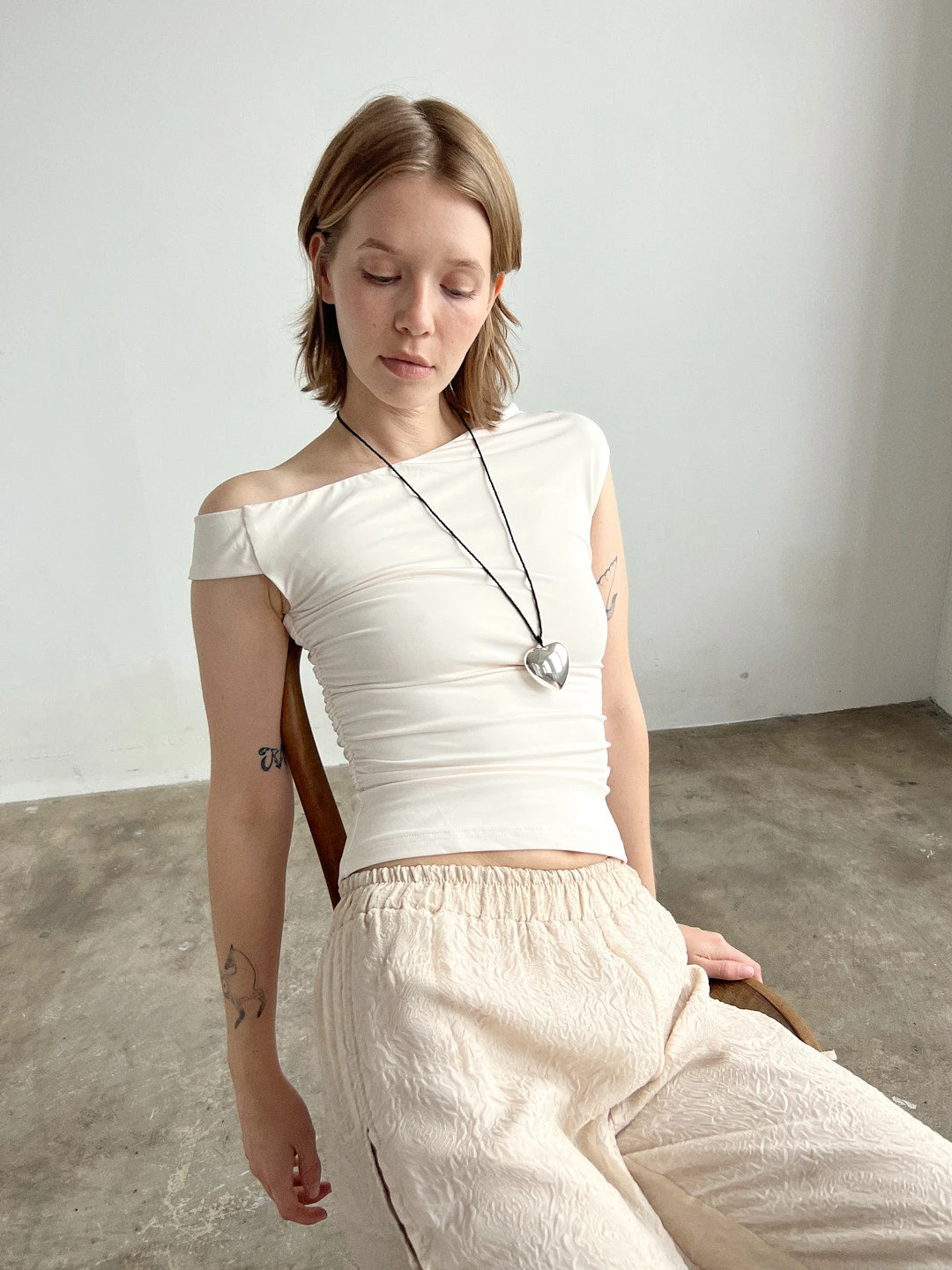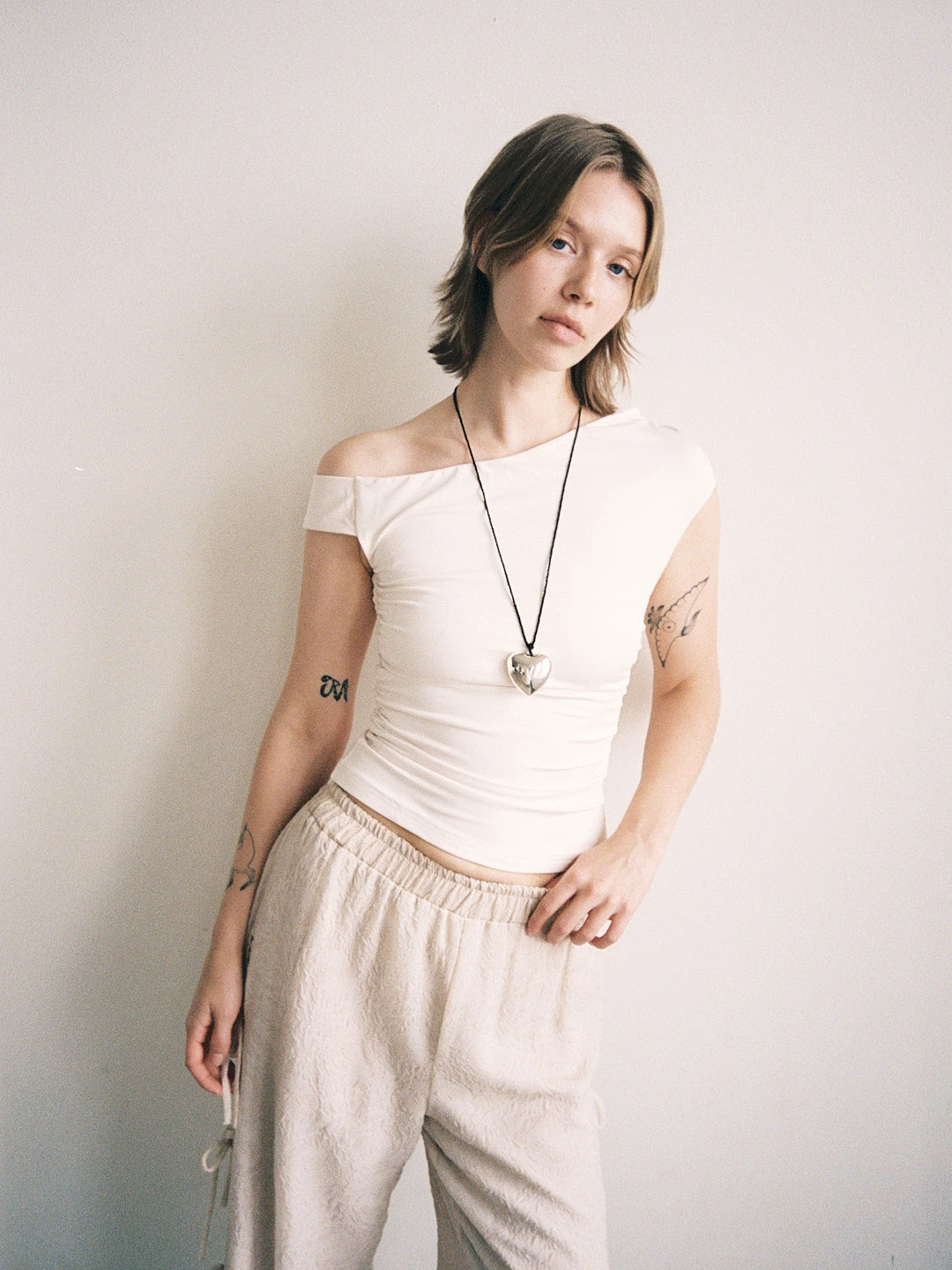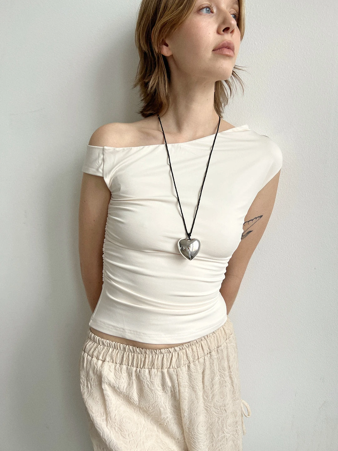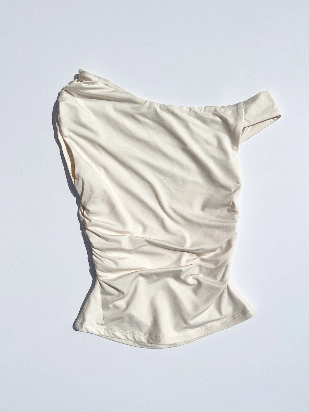Beige asymmetrical, off the shoulder neckline and ruching along the sides.