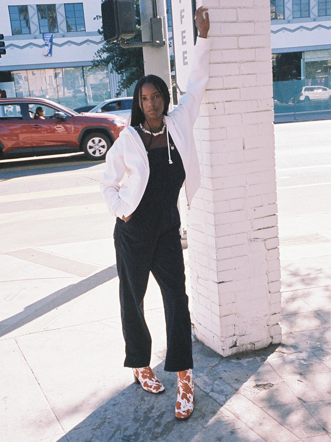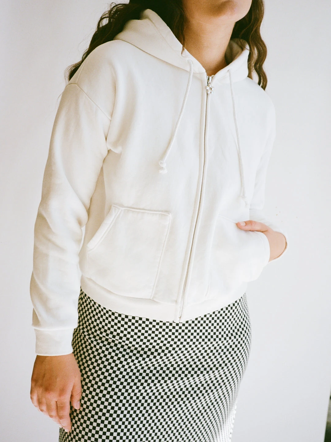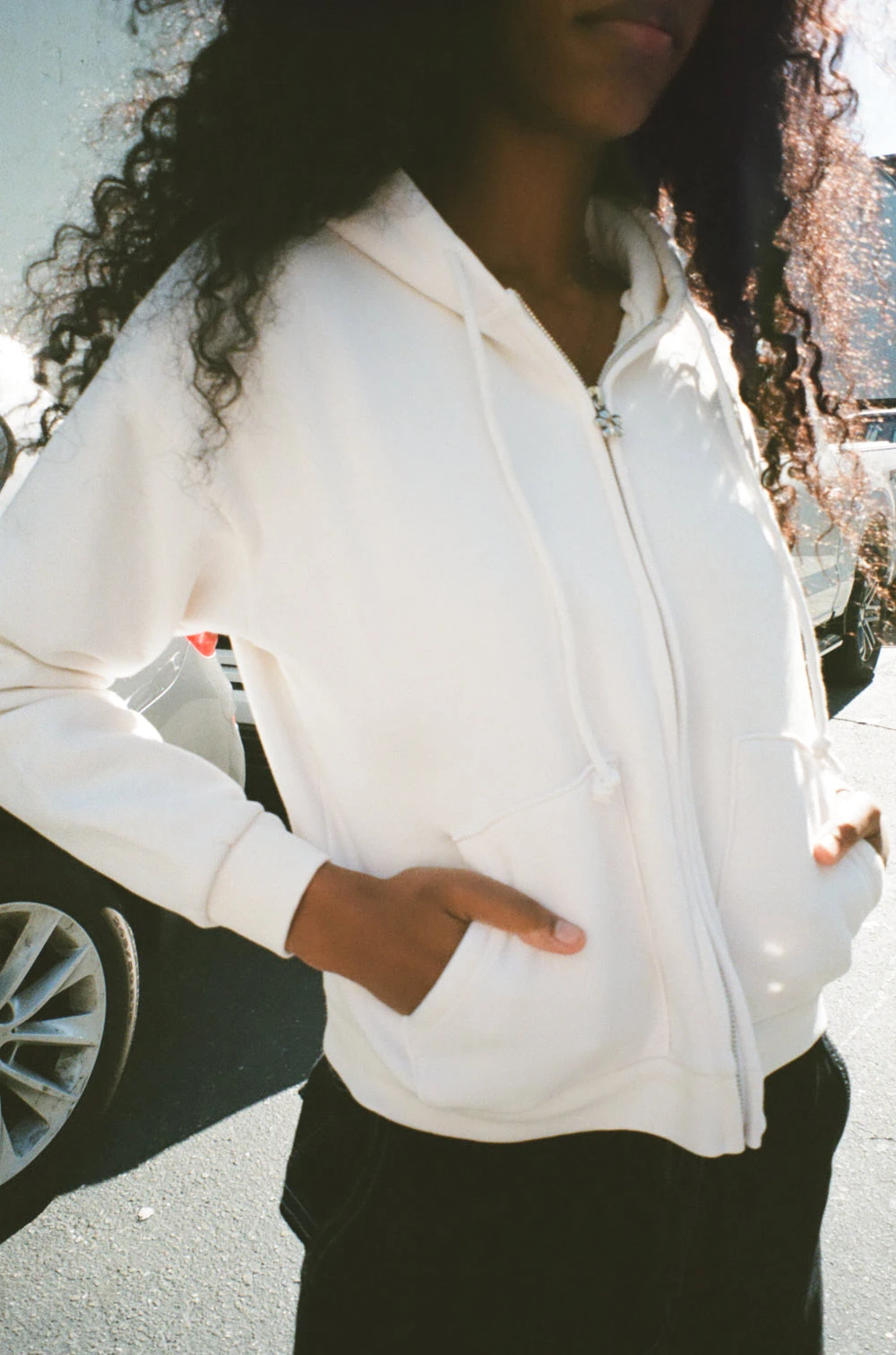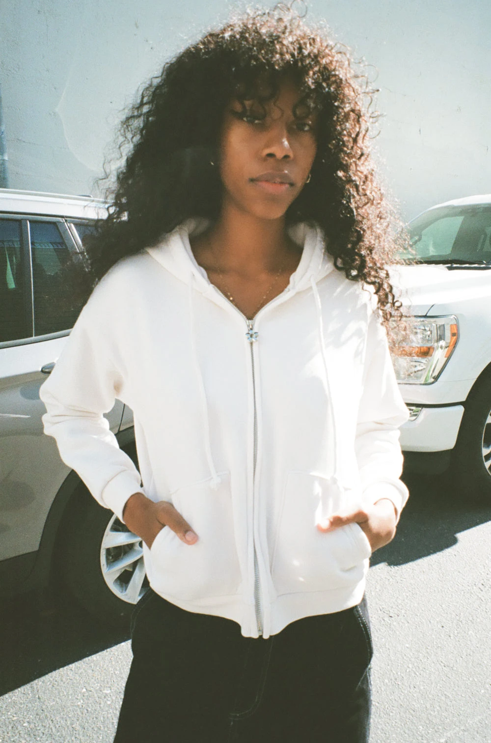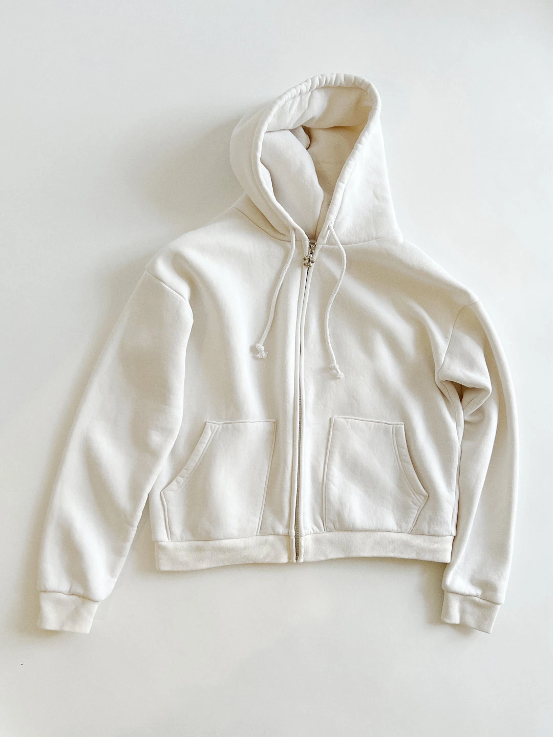 Shrunken classic zip-up hoodie in ivory. Ultra soft, and features our custom florette silver zipper!