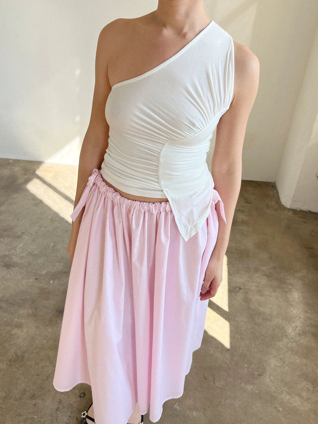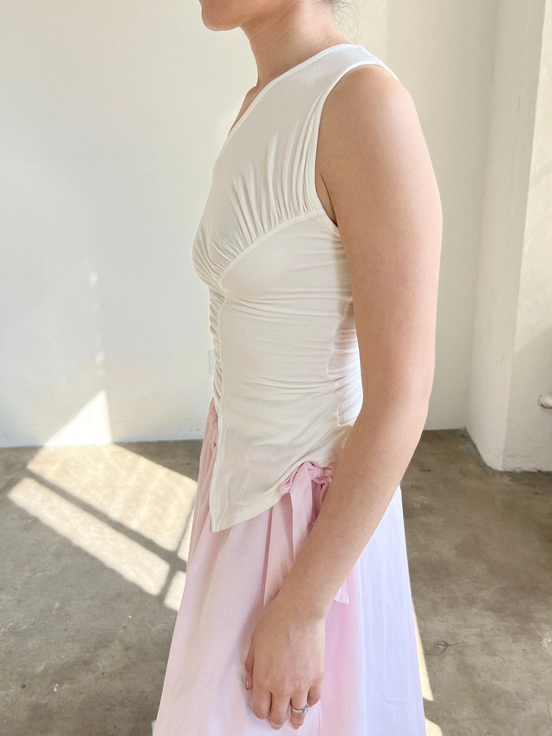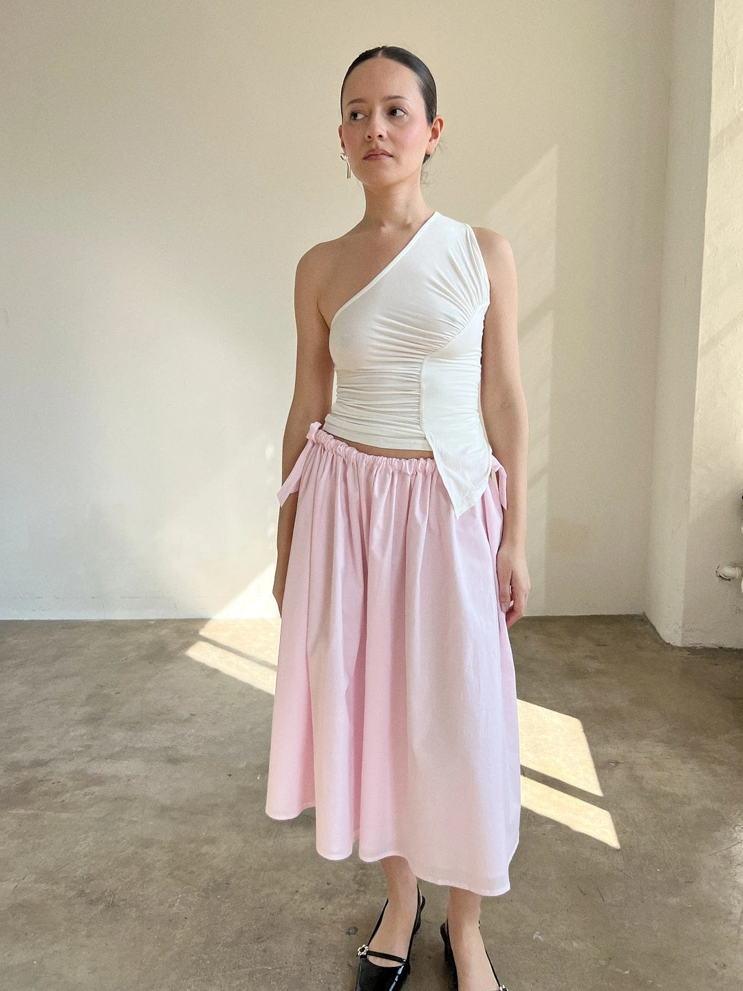 The Sakae Top boasts an unconventional neckline, a charmingly slanted ruched design, and an asymmetrical hemline.