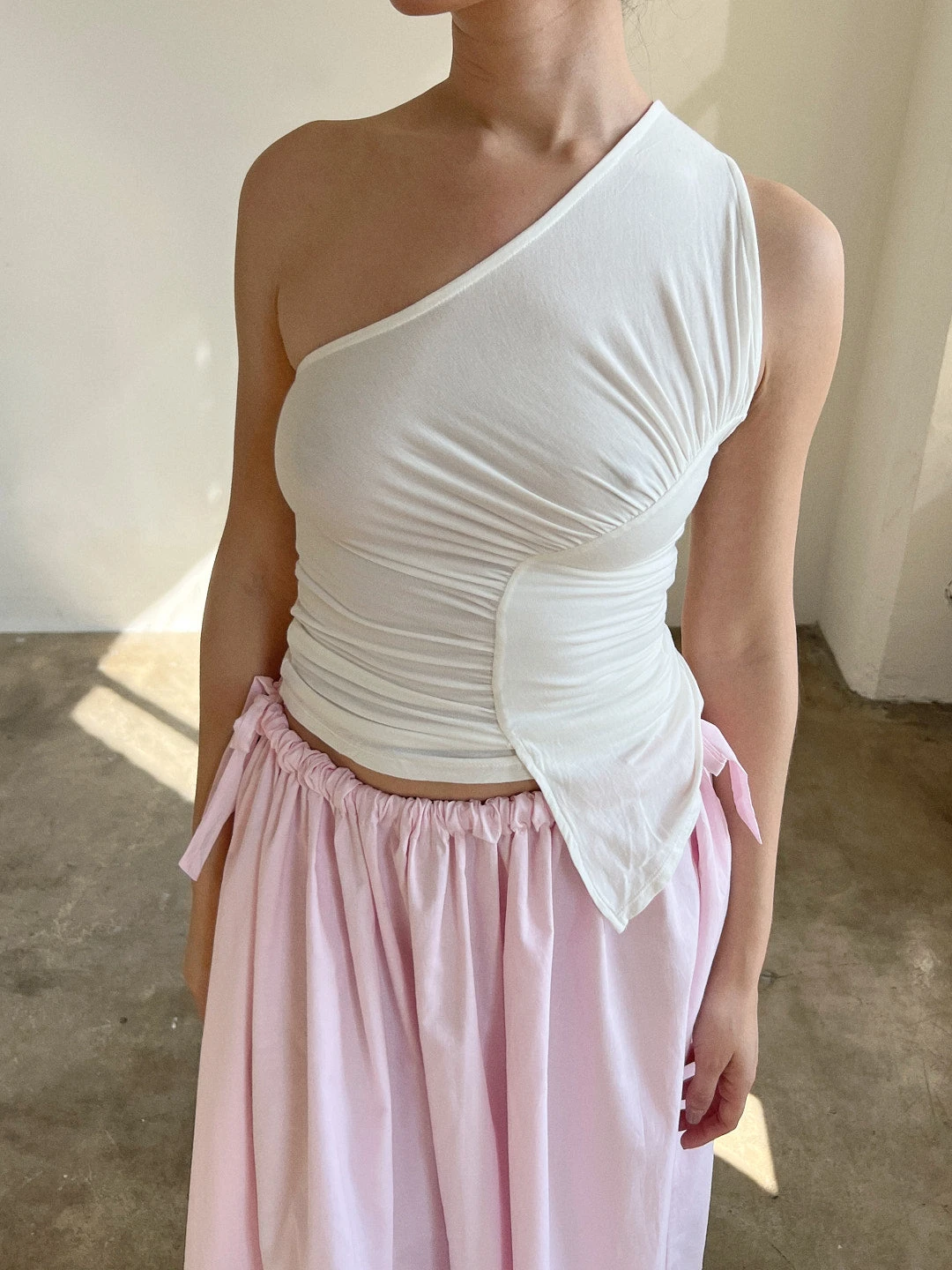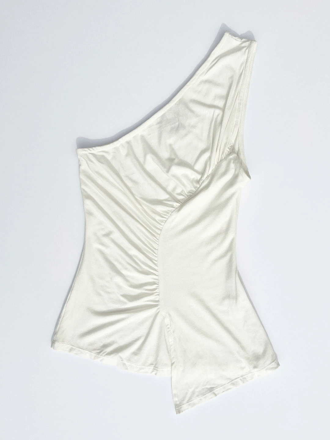 The Sakae Top features an asymmetric neckline, diagonal ruched detail, and asymmetric hem.