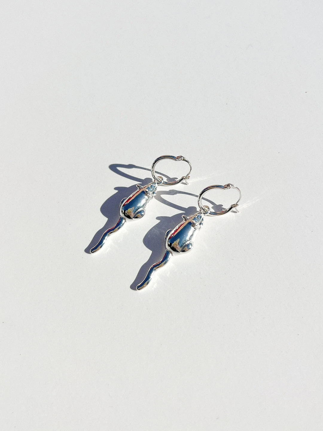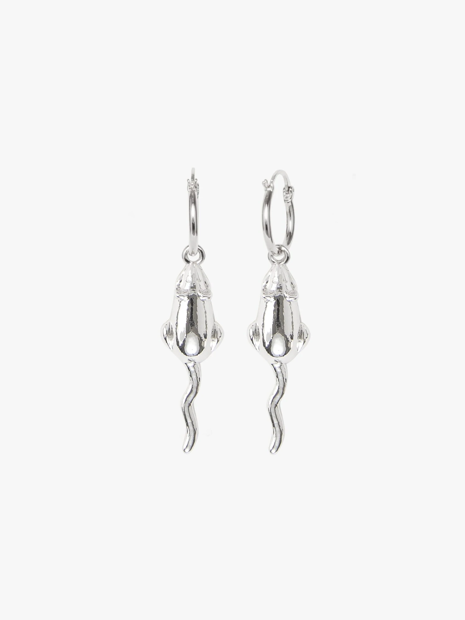 Adorable silver clasp hoops with a silver rat charm. Includes two earrings.