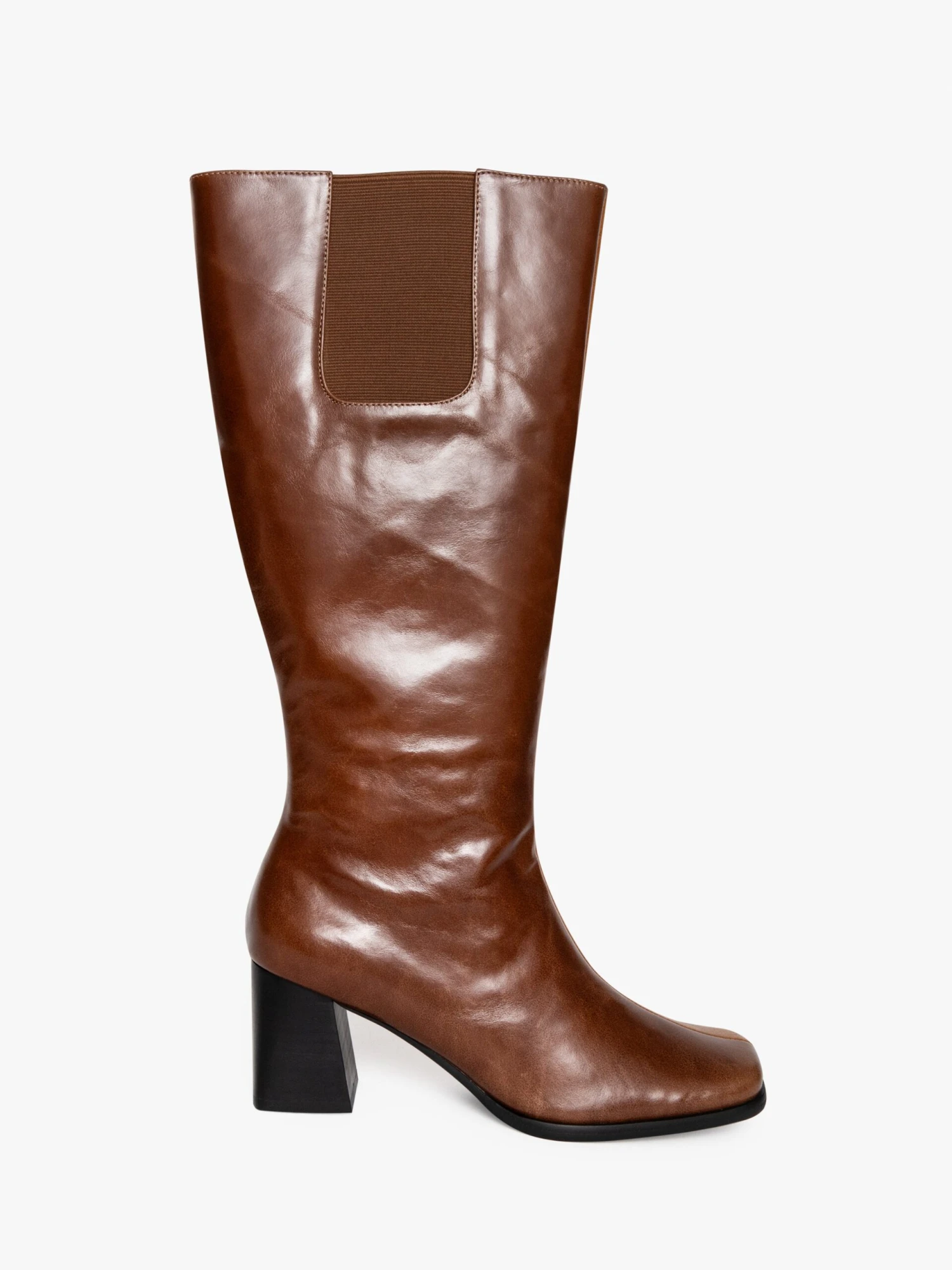 A two-tone knee high leather boot with a square toe and zipper, an elastic boot opening, featuring a silver flower detail and black sole.