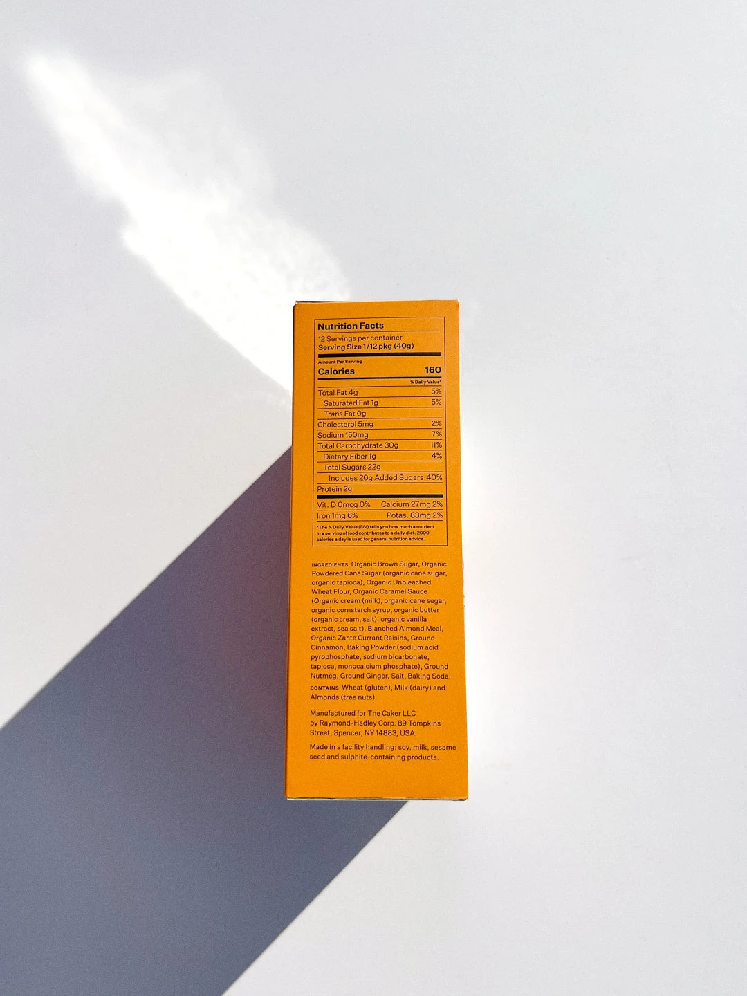Ingredients: Organic Brown Sugar, Organic Powdered Cane Sugar, Organic Unbleached Wheat Flour, Organic Caramel Sauce (Organic cream (milk), organic cane sugar, organic tapioca syrup, organic butter (organic cream, salt), organic vanilla extract, sea salt), Blanched Almond Meal, Organic Zante Currant Raisins, Ground Cinnamon, Aluminium Free Baking Powder, Ground Nutmeg, Ground Ginger, Salt, Baking Soda.