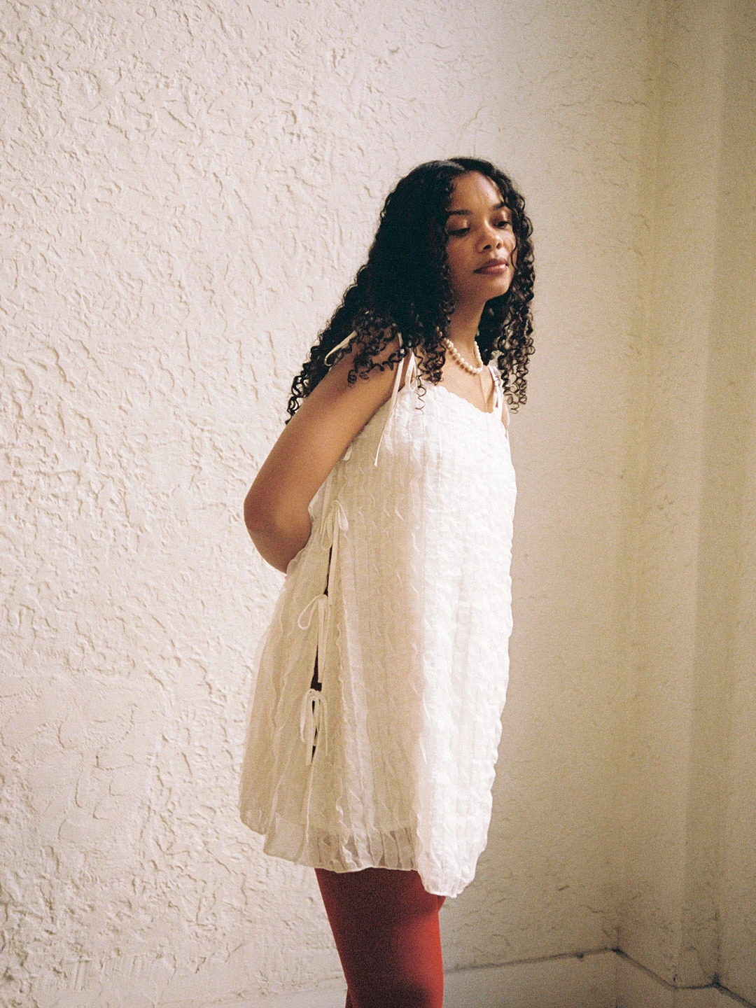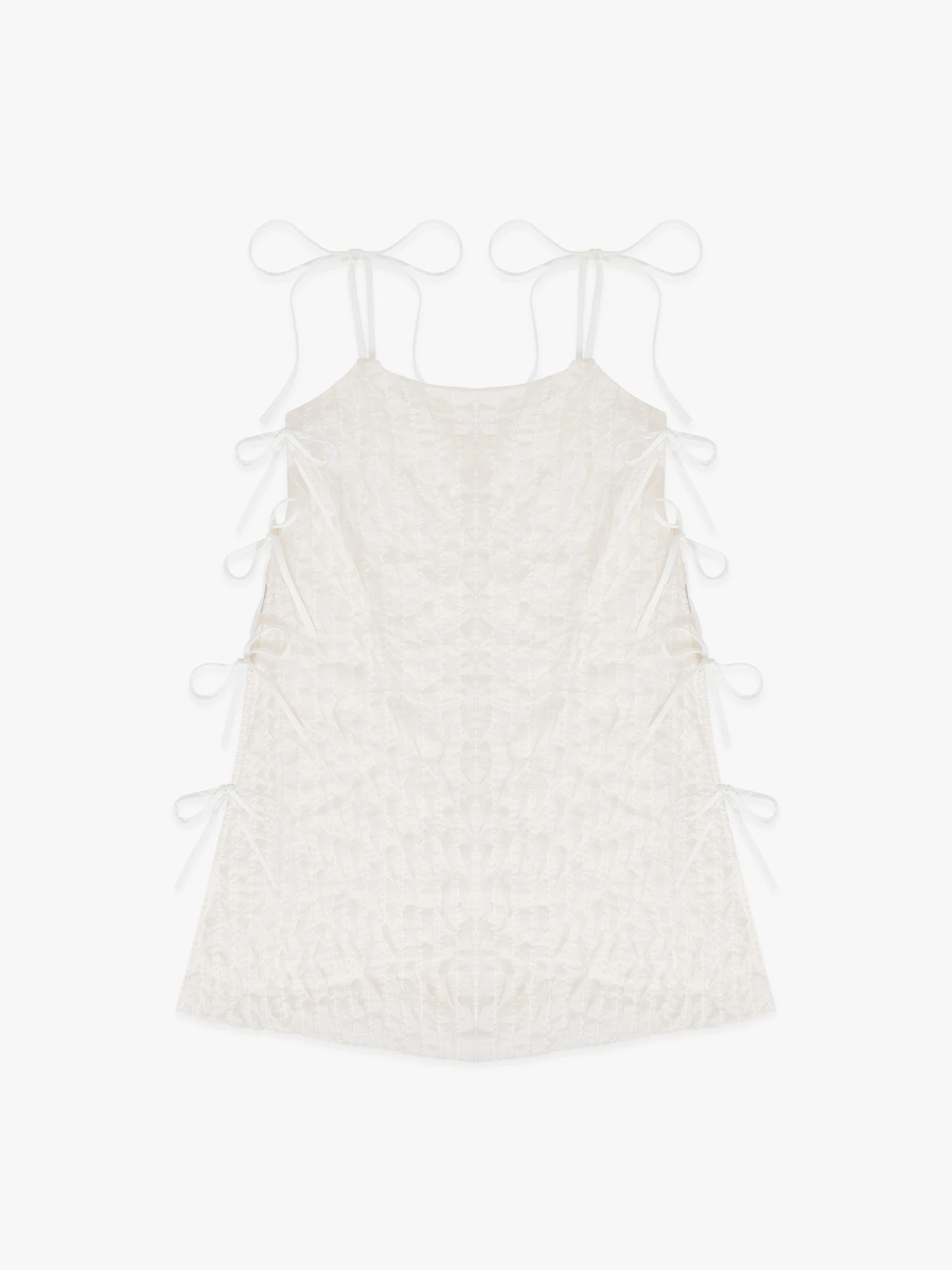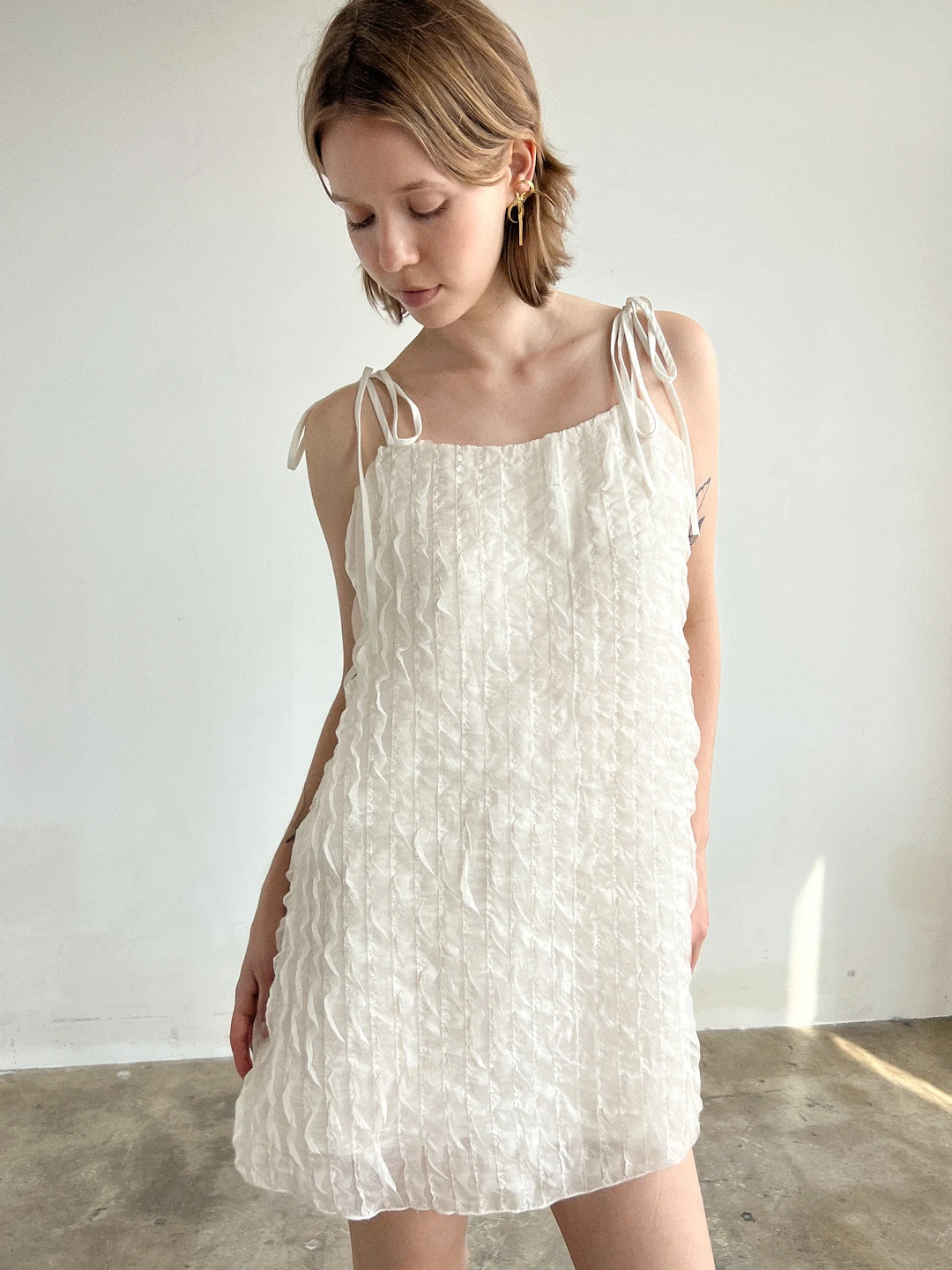 Get ready to be the center of attention in this vanilla-colored, fully lined, ruffle-adorned mini dress! With adjustable side bow ties and tie straps, this dress is as versatile as it is playful. Perfect for any occasion, and sure to turn heads.
