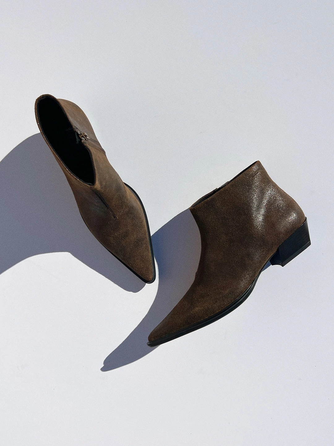 The Cassie Boot – Mocca Brown is made from textured leather, with a pointed toe, decorative seams, and a side zip for easy on and off!
