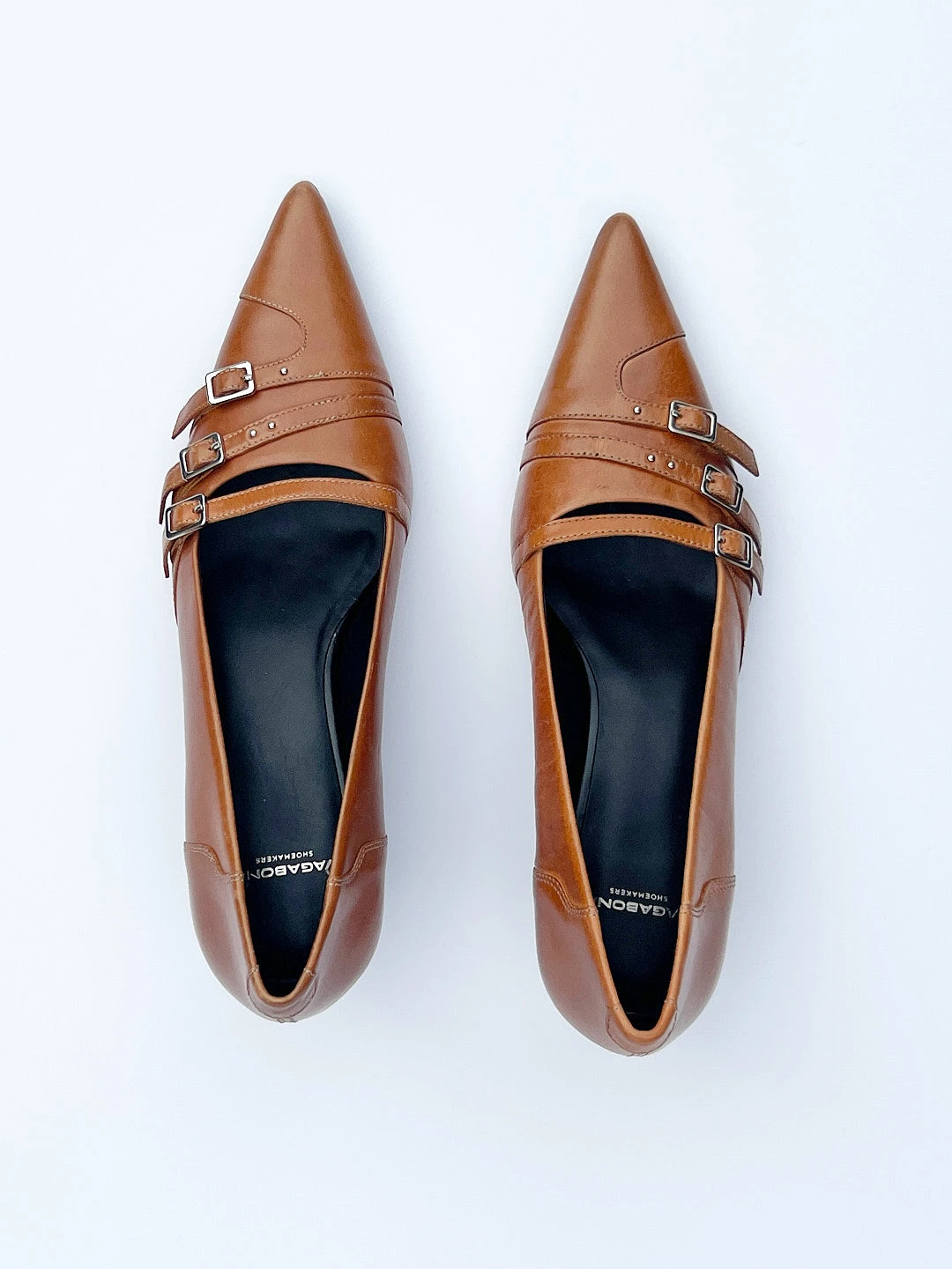 The Lykke heel is crafted from cognac brown leather featuring silver-toned buckle details, a pointed-toe shape and leather insoles.