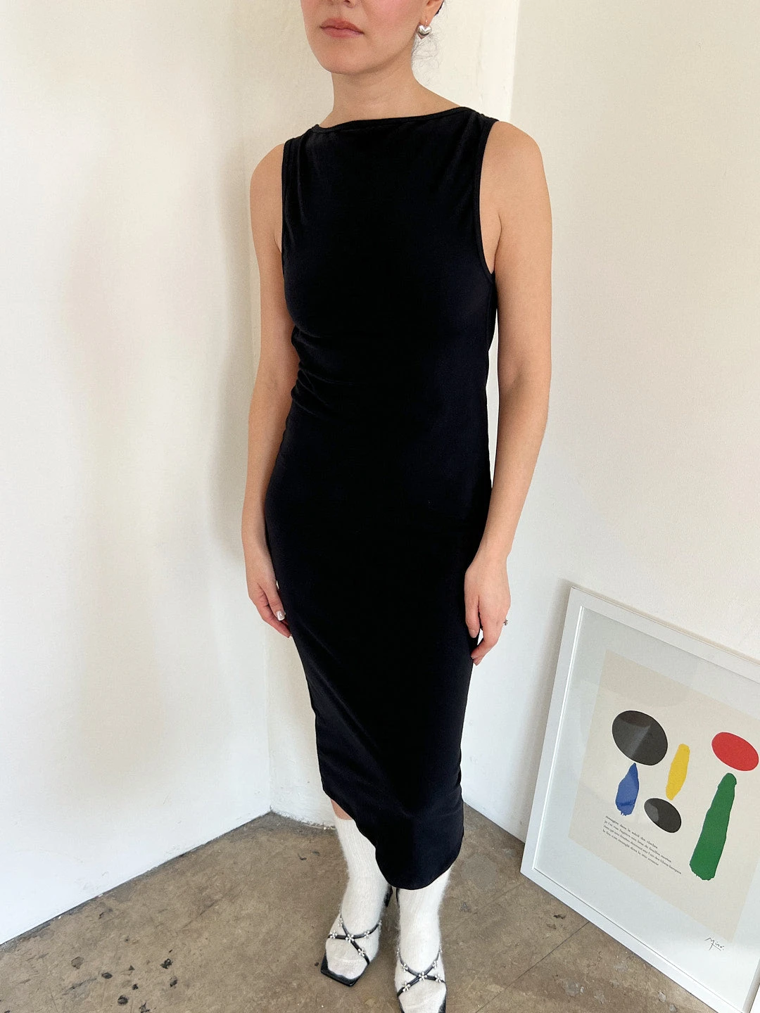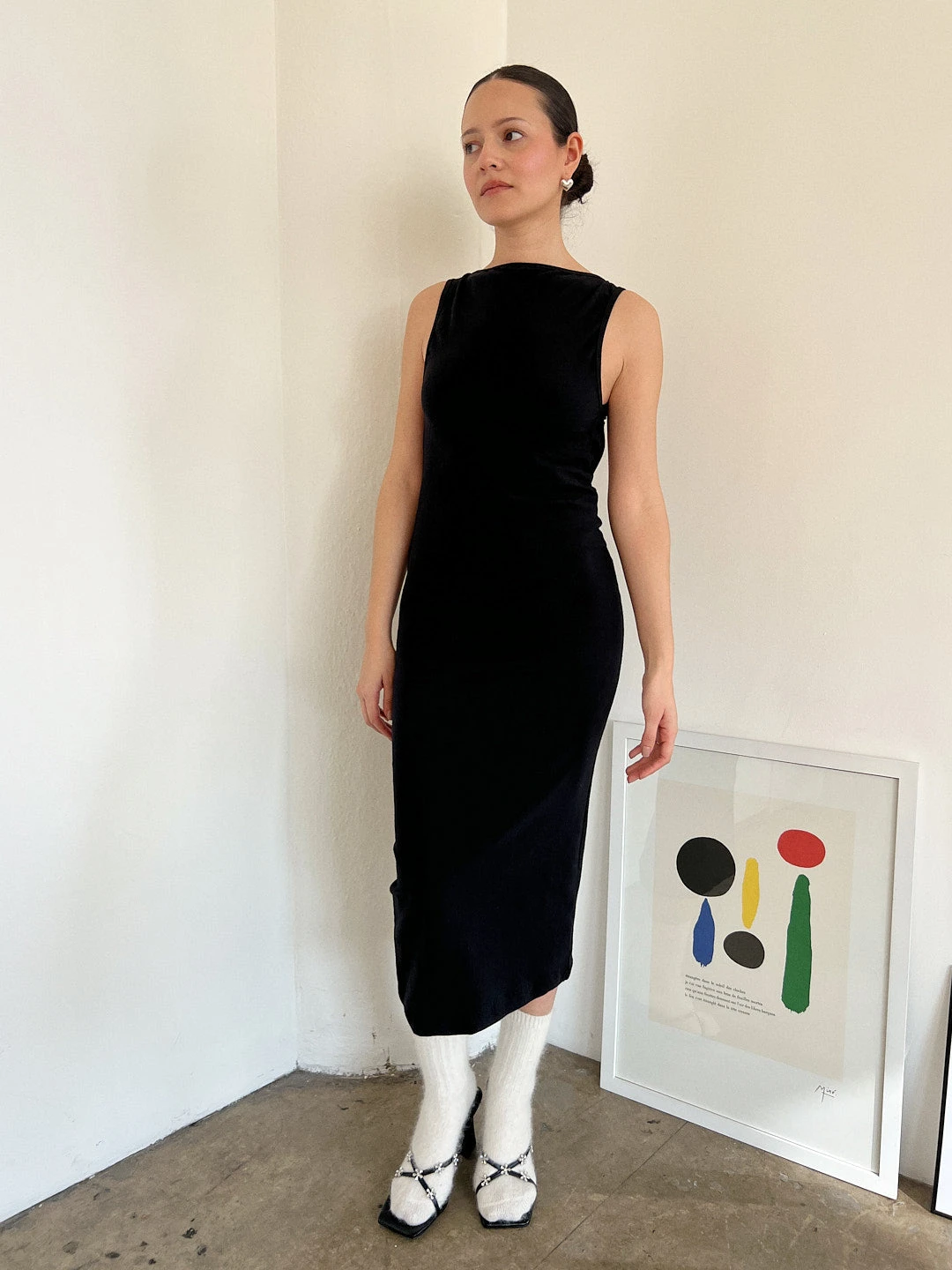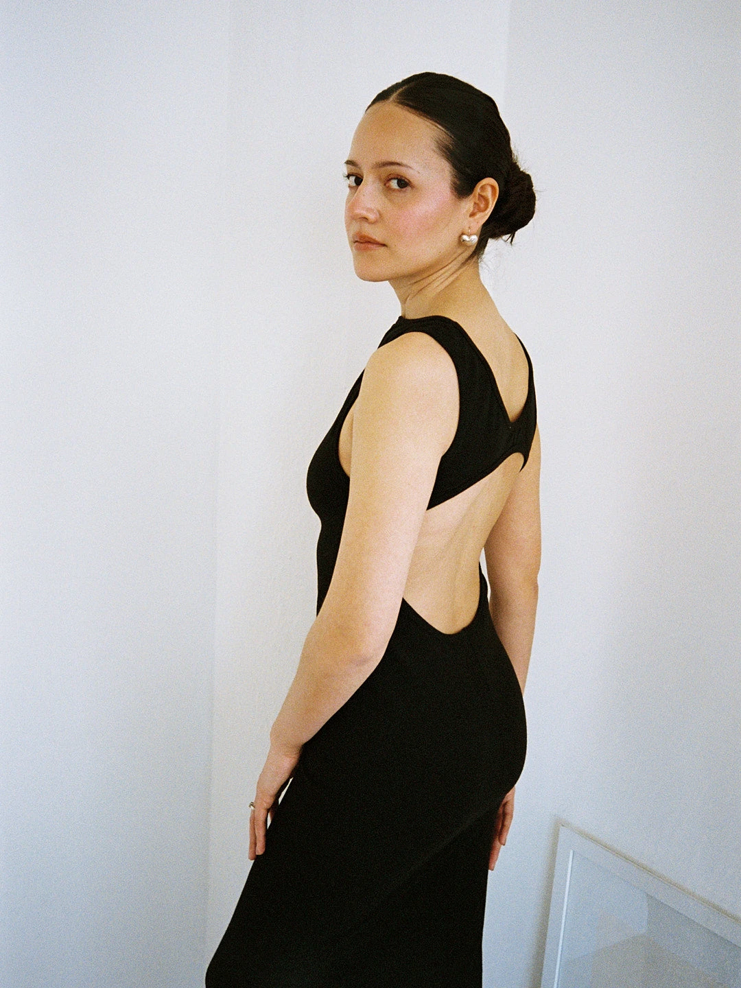 A sleek and stylish black midi dress featuring a high neckline and a playful open back.